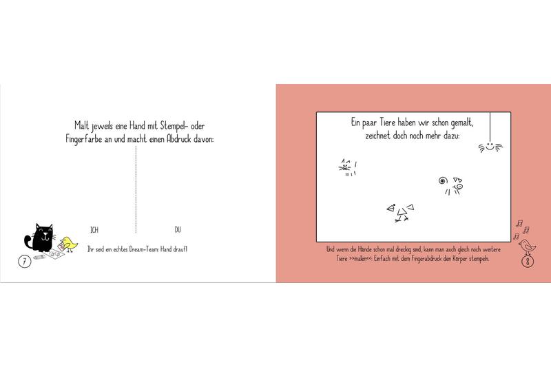 Das geheftete Büchlein im Din A5 Format mit Softcover enthält neben ausreichend Platz für Geschwister-Fotos z. B. beim ersten Kennenlernen, dem ersten gemeinsamen Urlaub oder dem ersten Weihnachtsfest auch einige Aktionsseiten. So können z. B. Hand-Abdrücke verewigt und lustige Fingerabdruck-Tierchen gestempelt werden. Oder es werden Urlaubserinnerungen als Gemälde bzw. Bastelarbeit festgehalten. Und Essens-Kleckse werden mit Wasserfarben aufs Papier gebracht.